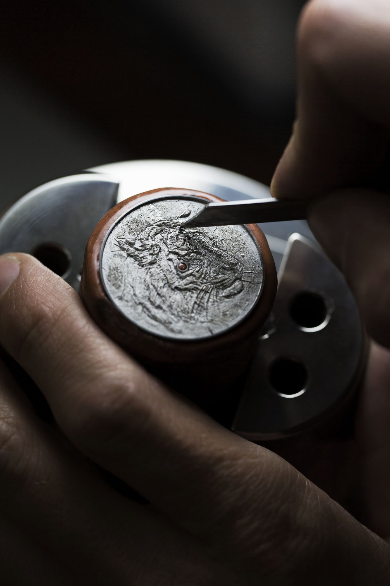 By accumulating in the most sunken areas, the material becomes denser and darker, while the most highly raised zones are barely covered and thus remain very light in colour. The technique calls for an entirely different approach from that of traditional relief engraving. The cavities and raised areas are fashioned exclusively according to the light they will catch or re ect, which is why an Email Ombrant engraving is revealed only once captured in enamel.